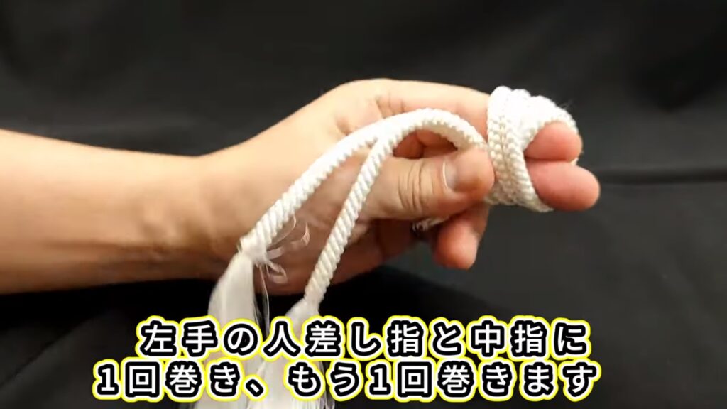 1.左手の人差し指と中指に1回巻き、もう1回巻きます。