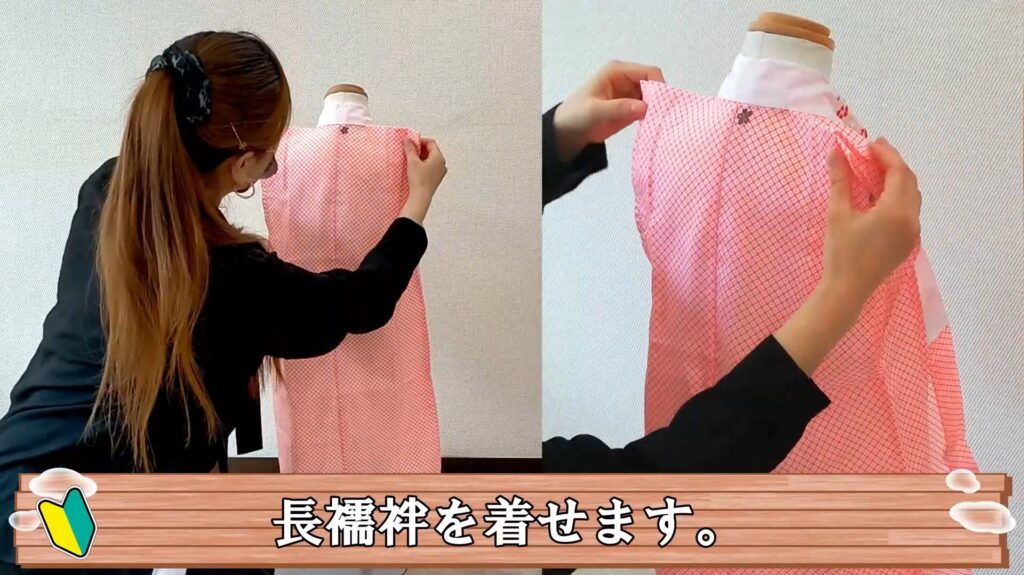 4.腰紐を結んだら長襦袢のシワを伸ばします。